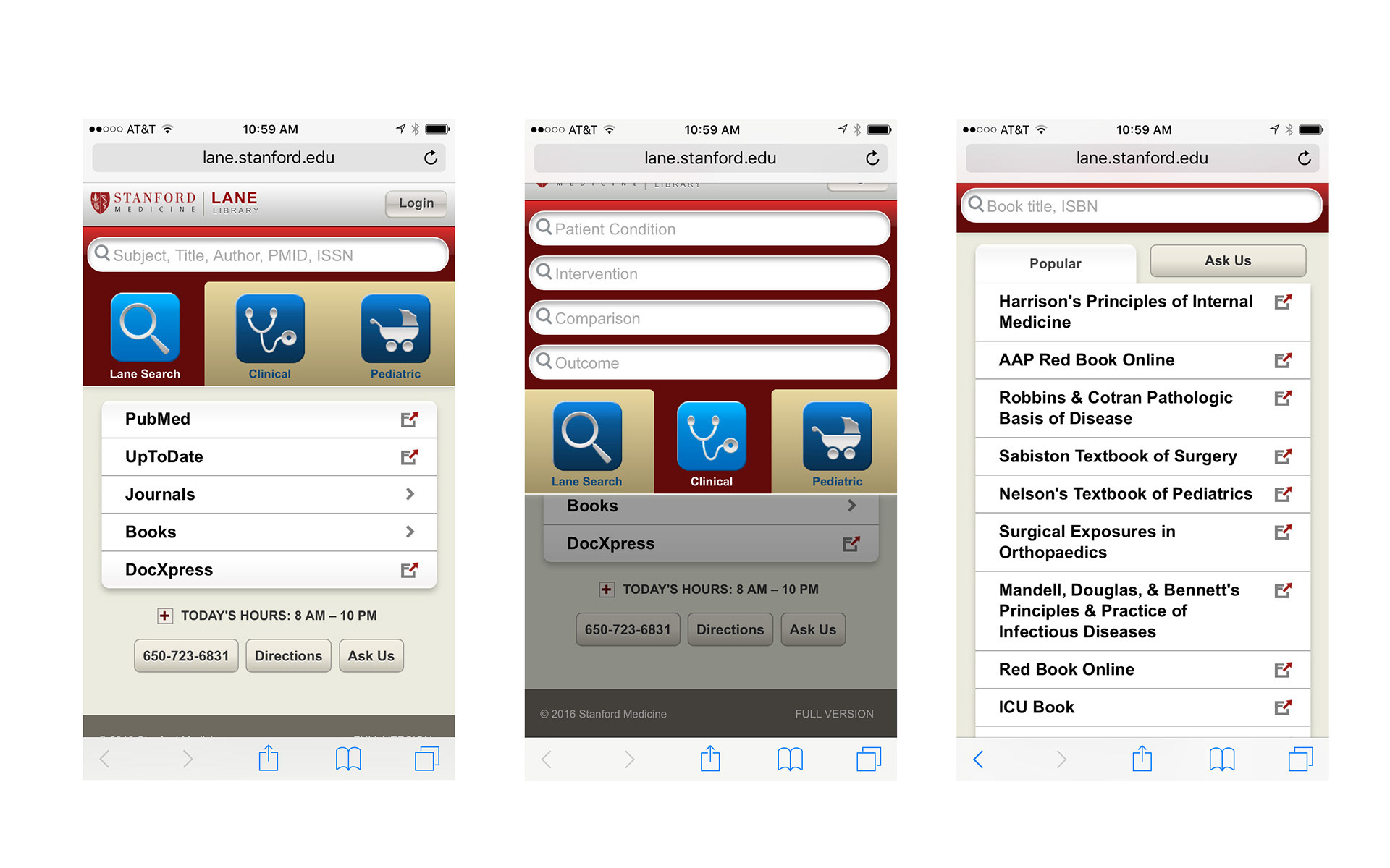 The first version of the medical library’s website, Lane Mobile, was also the first ever mobile application at the Stanford School of Medicine developed in 2008. We are currently working on the fully responsive site.